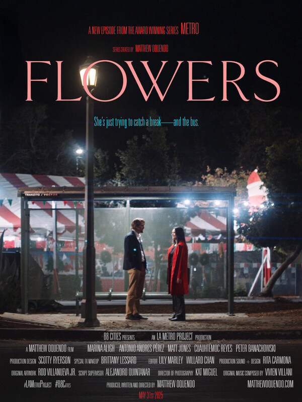 FLOWERS follows Candace Chapman (Marina Aligh), a struggling waitress trying to catch a break—and the bus. After a nightmare job interview, Candace misses her bus to work, gets followed by a guy at a bus stop—already a start to a terrible day. That is, until she meets Jeff (Peter Banachowski), who just got stood up... on his anniversary.